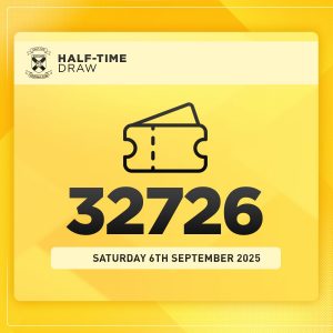This graphic is designed for a simple, live match update. Its primary Functionality is to announce the winning number for the half-time draw. It features no Photography, as the focus is solely on the number itself. The “32726” is the central and most prominent element, rendered in a large, bold font that is highly readable from a distance on a mobile phone screen. A simple icon of two tickets adds a visual cue that immediately communicates the graphic’s purpose. The Branding & Layout is perfectly aligned with the other minimalist matchday graphics, using the same yellow background and clear typography. How it fits in the overall picture: This graphic reinforces the brand’s consistent style for all aspects of the matchday experience, from the game itself to the fan activities, showing a unified approach to all communications.