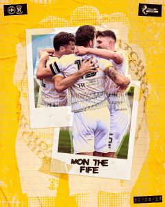 This graphic is a great example of a more artistic, non-functional piece of content designed for social media engagement. Its Functionality is to capture and celebrate a moment from a previous match. It is driven almost entirely by Photography, using two Polaroid-style photos of players celebrating. The use of a crumpled paper background effect gives it a retro, authentic and personal feel, as if it’s a cherished scrapbook memory. The phrase “MON THE FIFE” is a great piece of fan-centric language that makes the content feel more intimate and real. The Branding & Layout is different from the other graphics, but it still maintains the club’s yellow and black colour palette and includes the crests discreetly. How it fits in the overall picture: This graphic adds an emotional and artistic dimension to the brand’s visual identity. It shows the club is capable of creating diverse content that connects with fans on a deeper level, moving beyond simple information delivery to evoke a sense of community and shared passion.