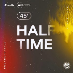 This graphic serves as a real time update, signaling the start of the second half. Its core Functionality is to inform fans that the game is resuming. The large, central “KICK OFF” text and the 45′ timestamp make the message instantly clear. There is no traditional Photography; instead, the graphic relies on the same dynamic, blurred background with a vibrant red and yellow gradient that evokes the energy of the game. The Branding & Layout is perfectly aligned with the other in-match graphics, using the club’s crest, the “Since 1876” detail, and the “#WEARETHISTLE” hashtag. This consistency ensures the graphic is immediately recognizable as part of the club’s matchday suite. How it fits in the overall picture: This graphic is a fundamental piece of the in game social media content. Its simplicity and clarity set the standard for all live match updates, creating a cohesive visual narrative from “Kick Off” to “Full Time.”