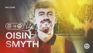 This graphic effectively announces a new player. Its core Functionality is to introduce a new signing to the fans. The Photography of the new player, Oisin Smyth, is well lit and professional. The portrait style photo makes the player the absolute central focus. A subtle red and yellow filter is applied, which helps to brand the photo and create a cohesive look. The Branding is strong, with the club crest and the familiar gradient background. The use of a simple icon to show the club transfer adds a modern, digital native touch. The Layout is clean and impactful, with the player’s name in a large, bold font that immediately draws attention. How it fits in the overall picture: This graphic is a crucial part of the club’s communication during the transfer window. Its polished and consistent design reinforces the club’s professional image and builds excitement among the fans.