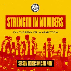 This graphic is a major promotional piece for the club. Its core Functionality is to drive season ticket sales. The Photography features a powerful image of the team, conveying a sense of unity and strength. The image is heavily filtered with the club’s colors, which gives it a gritty, impactful feel. The Branding is strong and powerful, with the distressed font for “STRENGTH IN NUMBERS” creating a compelling and emotional message. The bold red and yellow color palette is used intensely to make the graphic stand out. The Layout is straightforward, with the powerful message at the top and the clear call to action at the bottom. How it fits in the overall picture: This is a key example of how the club uses its branding for big campaigns. The design is bold and confident, which helps to convey a sense of passion and loyalty to the fans.